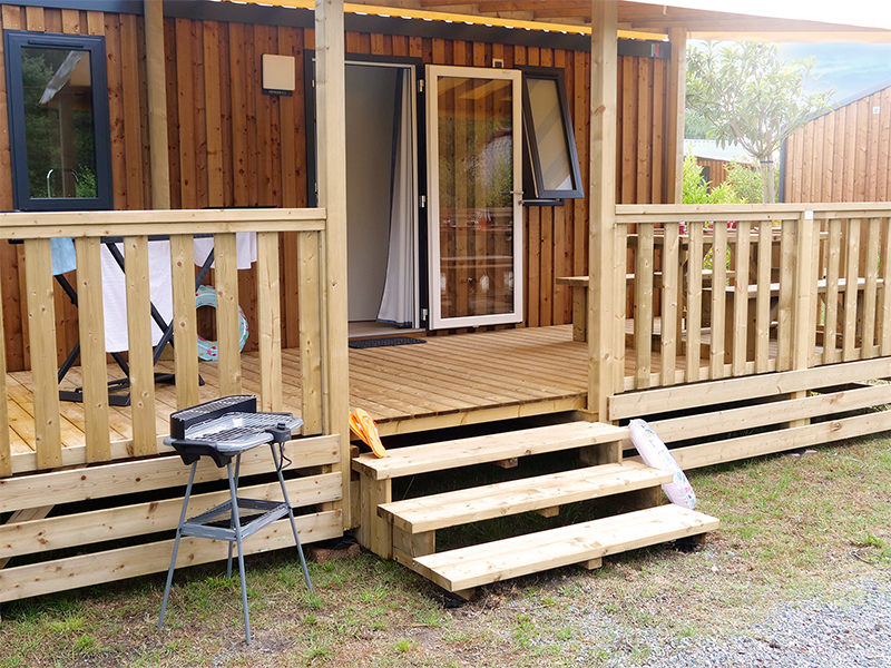 Draußen : komplette Gartenmöbel (1 Tisch, 6 Stühle und 2 Liegestühle) auf einer halbüberdachten Holzterrasse von 15 m². 1 zugewiesener Parkplatz. Barbecue auf Anfrage.