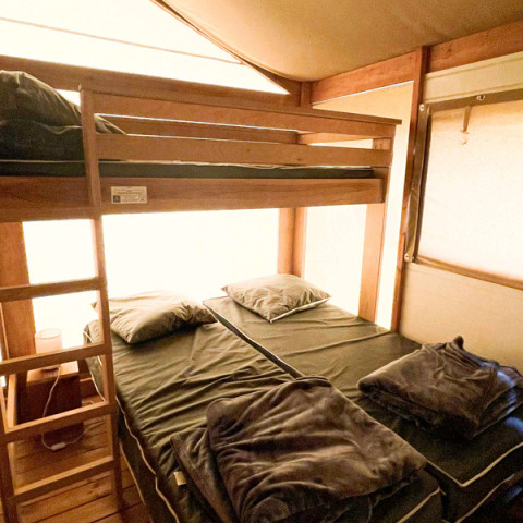 1 dormitorio con 1 cama doble de 160 x 190 cm. 1 dormitorio con 2 camas individuales plegables de 80 x 190 cm.