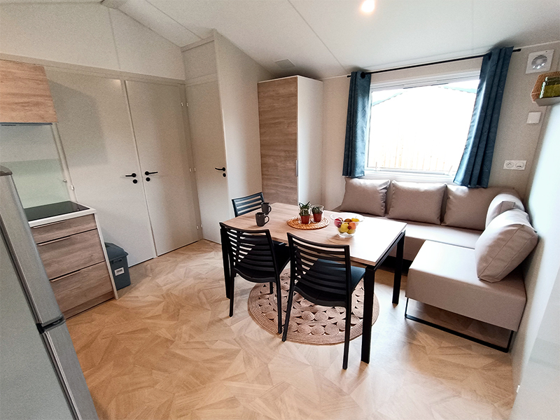 Un salón con zona de comedor, sofá cama convertible en 120 x 190 cm y aire acondicionado reversible. TV de pantalla plana y Wifi.